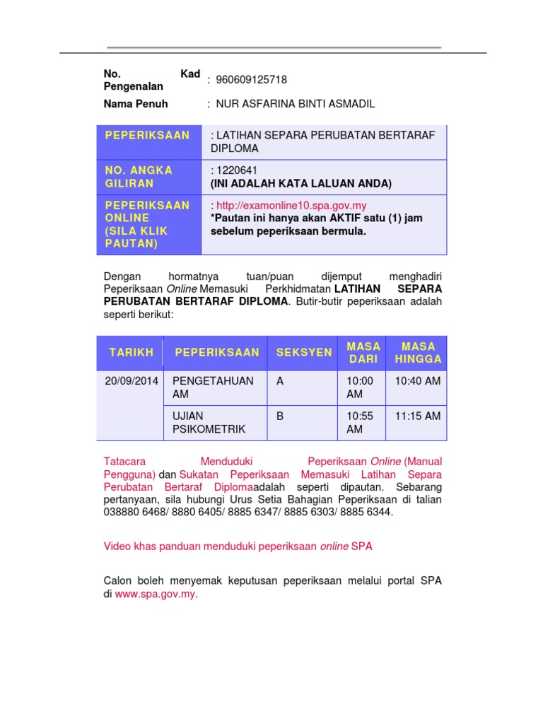 Peperiksaan online memasuki perkhidmatan awam (psee) latihan separa perubatan bertaraf diploma sesi januari 2020 di kementerian kesihatan. Menerusi portal rasmi spa, peperiksaan separa perubatan 2018 akan diadakan pada 29 mac 2018 secara online di laman sesawang spa8i. Semakan juga boleh dilakukan melalui portal spa pada bulan oktober bagi sesi kemasukan januari dan bulan april bagi sesi kemasukan julai. Di bawah merupakan koleksi contoh soalan latihan separa perubatan bertaraf diploma yang boleh dijadikan latihan calon peperiksaan. Pemohon pekerjaan / latihan separa perubatan.